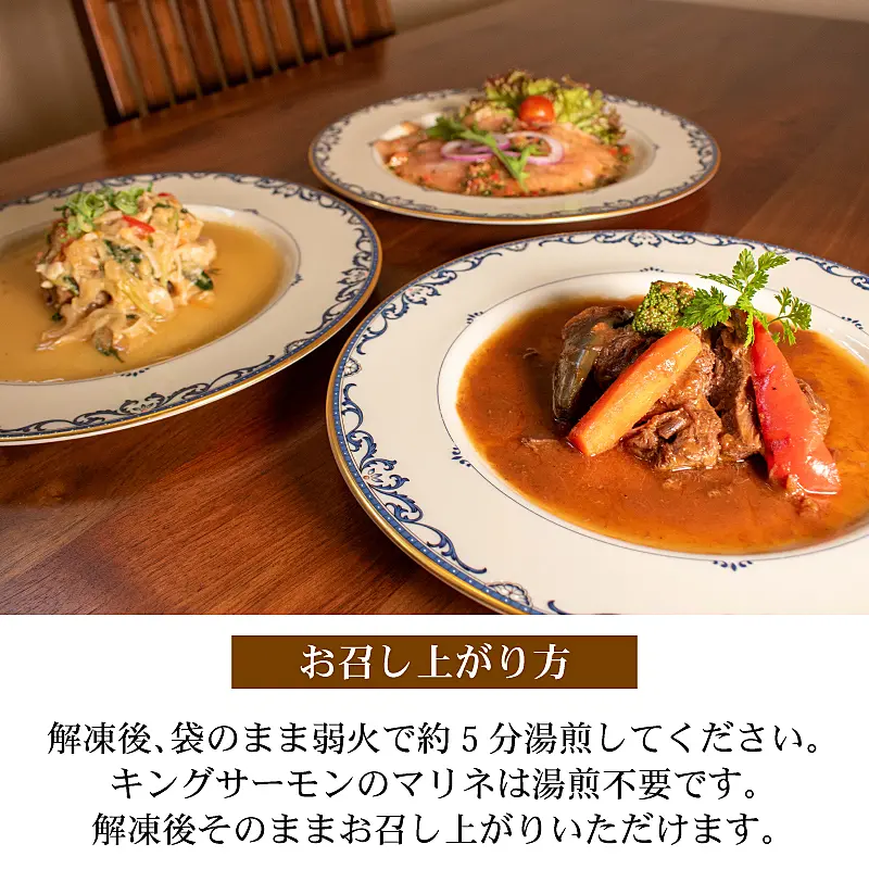 - 合計3パック ・牛ホホ肉の柔らか煮(220g)×1パック ・ポークの煮込み野菜餡かけソース(220g)×1パック ・キングサーモンのマリネ(100g)×1パック