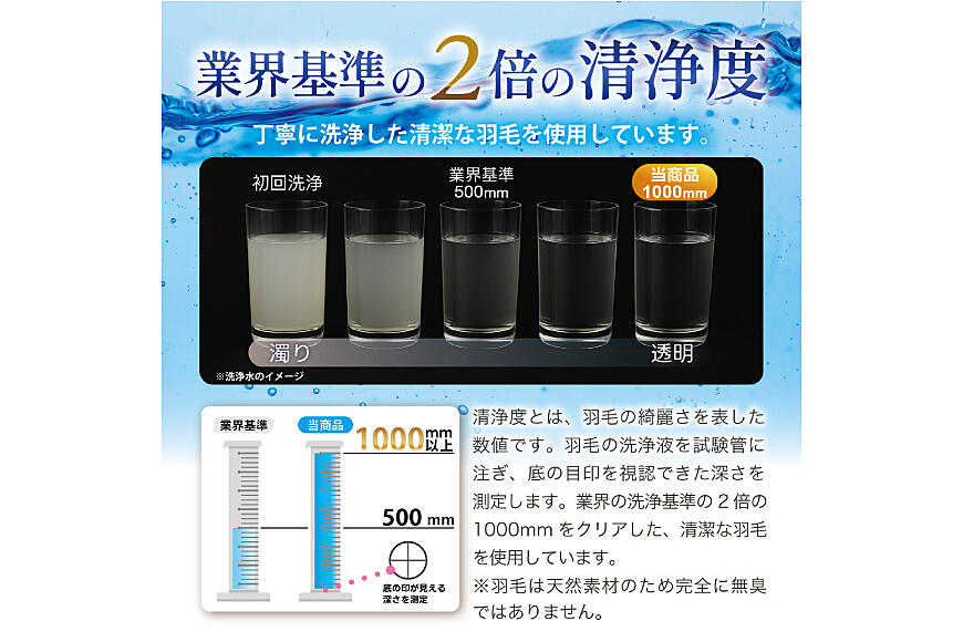 羽毛は清浄度1,000mm以上の厳しい洗浄基準をクリアしています。