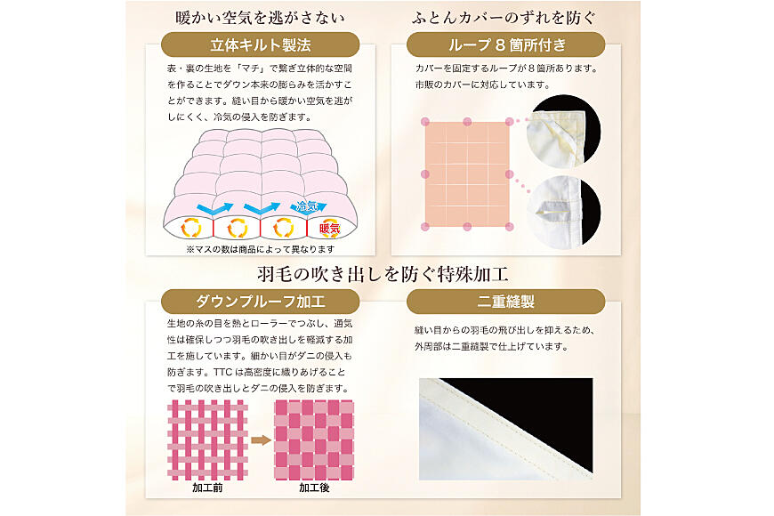 ※羽毛布団の特性上、縫い目や側生地からごく微量の羽毛が出てくることがありますが使用上問題はありません。