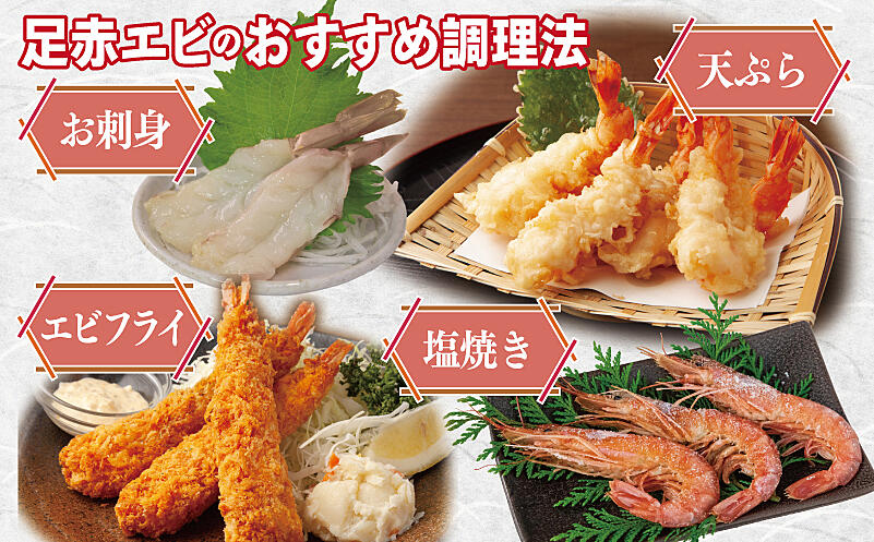 身が大きく、火を通しても縮みにくいのも足赤エビならではの特長。加熱すると殻やしっぽが鮮やかな赤色に発色し、食卓も一気に華やかになります。塩焼きで香ばしく、天ぷらやエビフライでぷりっとした存在感を、アヒージョでは旨みがオイルに広がり、もちろんお刺身でも格別の甘みを堪能できます。