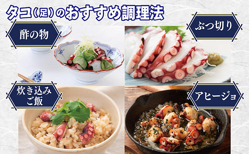 ぶつ切りにしてさっぱり酢の物、やわらかく炊き込んで香り豊かな蛸飯、衣をつけてカラッと唐揚げに──どんなお料理にもよく合います。下処理済みなので、解凍すればすぐに調理OK!
