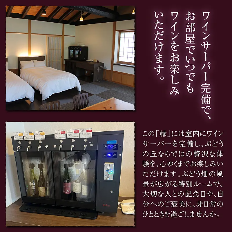 18畳の広々した空間は、日本の伝統美と現代の快適さが融合した、心安らぐ雰囲気を表現し、この「縁」には室内にワインサーバーを完備し、ぶどうの丘ならではの贅沢な体験を、心ゆくまでお楽しみいただけます。