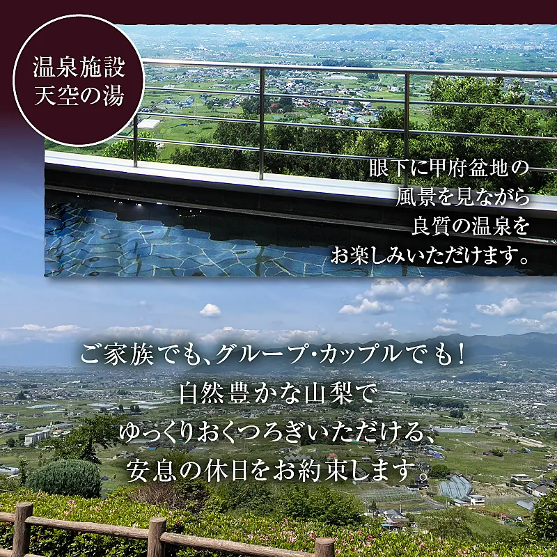 また、温泉施設「天空の湯」では、眼下に甲府盆地の風景を見ながら良質の温泉をお楽しみいただけます。
