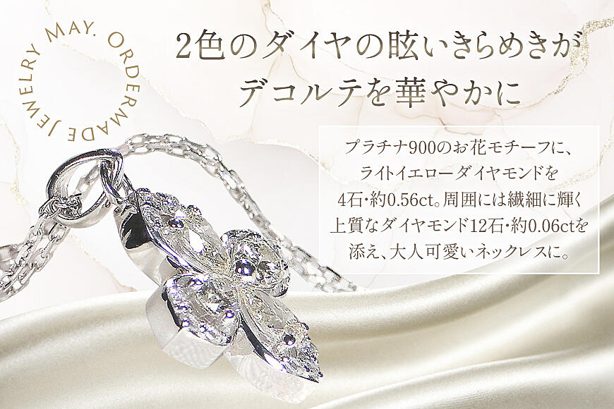 プラチナ900のお花モチーフに、ペアシェイプカットを施したライトイエローダイヤモンドを4石・約0.56ctをセッティング。
