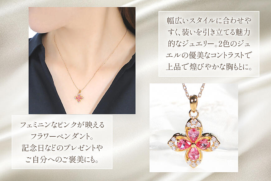 K18イエローゴールドのお花モチーフに、鮮やかな発色できらめくペアシェイプカットのピンクスピネル4石をセッティング。
