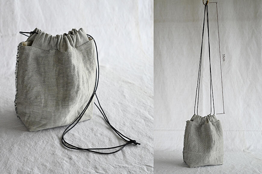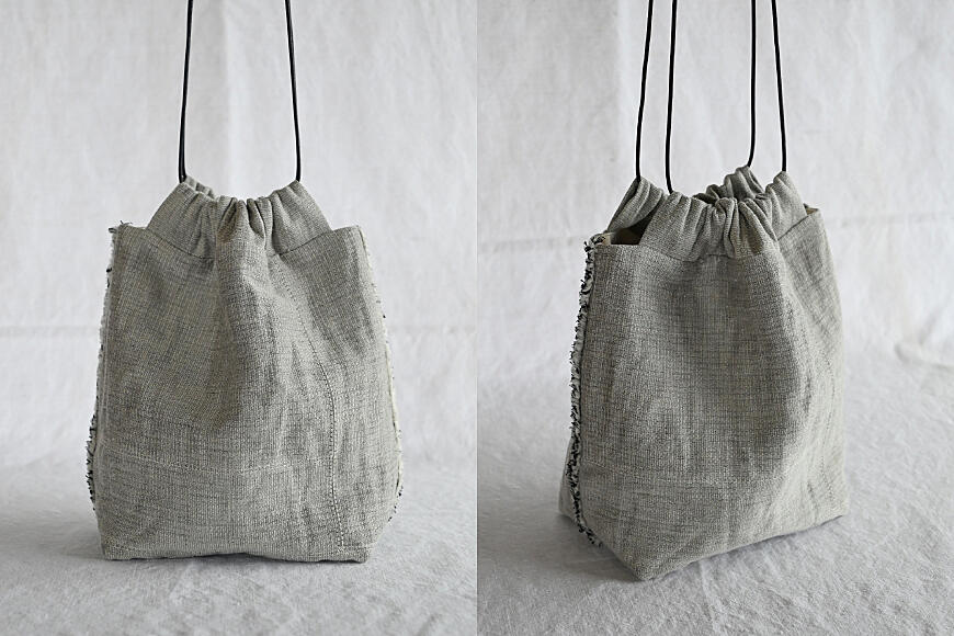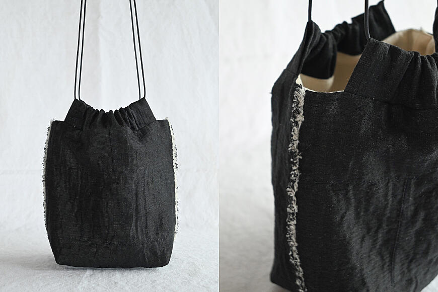 二重織地(黒or白×生成り)のはぎれを継ぎ接いだ巾着バッグ。