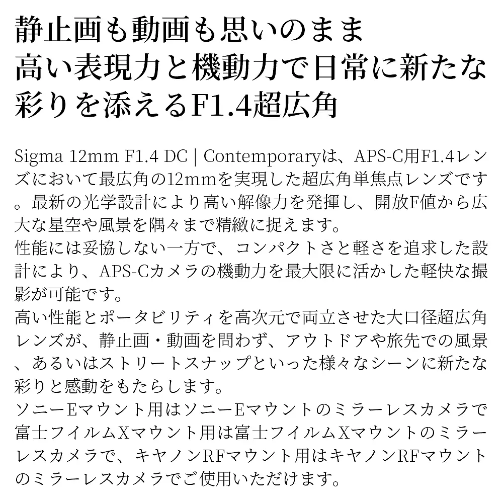 Sigma 12mm F1.4 DC | Contemporaryは、APS-C用F1.4レンズにおいて最広角の12mmを実現した超広角単焦点レンズです 。