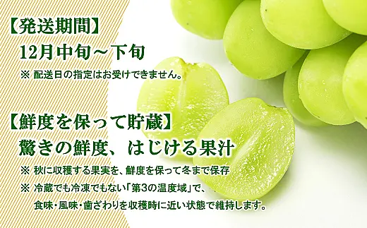 ぶどうが凍らない「冷蔵でも冷凍でもない第3の温度域」で、食味・風味・歯ざわりを収穫時に近い状態で維持しております。