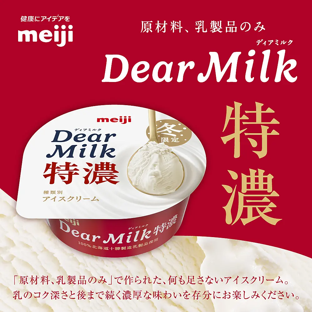目指したのは、従来のミルクを超えた味わいミルクアイス!余分なものは加えず明治独自の乳製品だけをたっぷり使用し、乳のコク深い食べ応えでスッキリした後味、なめらかな舌触りを実現しました。