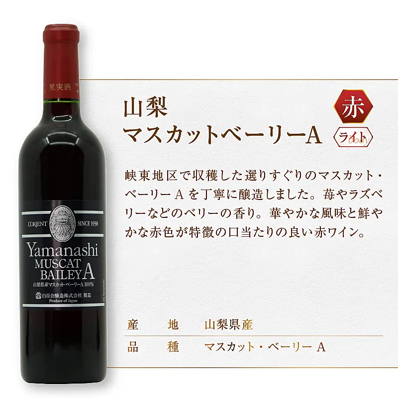 特徴:峡東地区で収穫した選りすぐりのマスカットベーリーAを丁寧に醸造しました。苺やラズベリーなどのベリーの香り。華やかな風味と鮮やかな赤色が特徴の口当たりの良い赤ワイン。