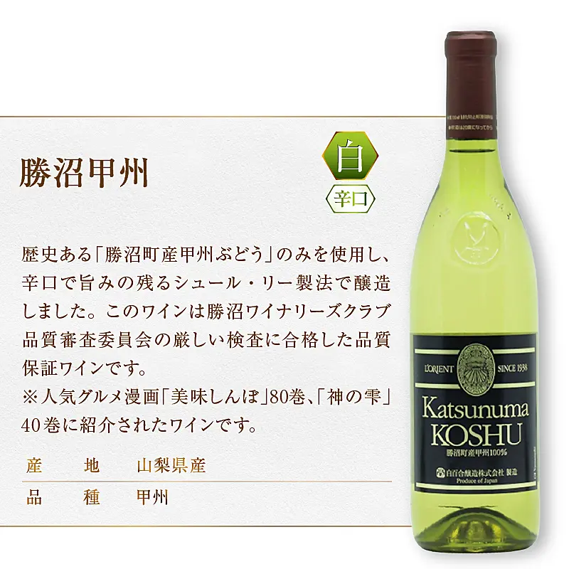 特徴:歴史ある「勝沼町産甲州ぶどう」のみを使用し、辛口で旨みの残るシュール・リー製法で醸造しました。