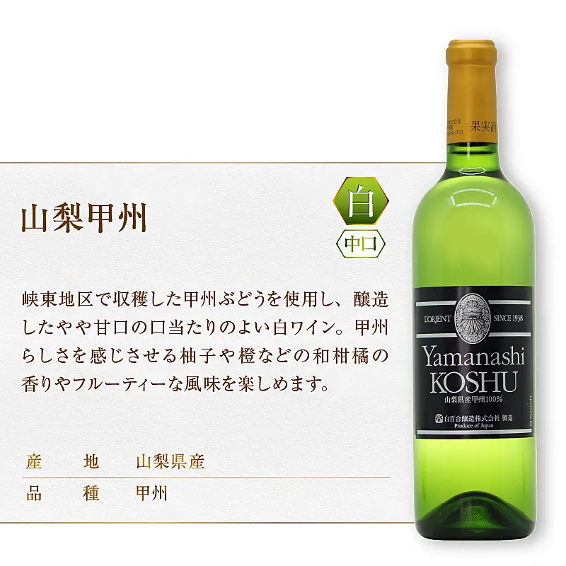 特徴:峡東地区で収穫した甲州ぶどうを使用し、醸造したやや甘口の口当たりのよい白ワイン。甲州らしさを感じさせる柚子や橙などの和柑橘の香りやフルーティーな風味を楽しめます。