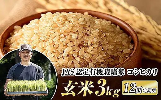 <定期便12ヶ月> JAS認定 有機栽培米 西会津産米コシヒカリ 玄米 3kg F4D-2090
