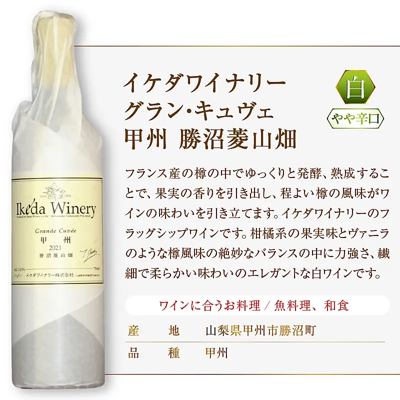 特徴:勝沼の中でも特に優良な産地として評価されている菱山地区の甲州種ぶどうを厳選。樽発酵した高級辛口白ワインです。10月中旬に収穫、フランス産の樽の中でゆっくりと発酵、熟成することで、果実の香りを引き出し、程よい樽の風味がワインの味わいを引き立てます。イケダワイナリーのフラッグシップワインです。
