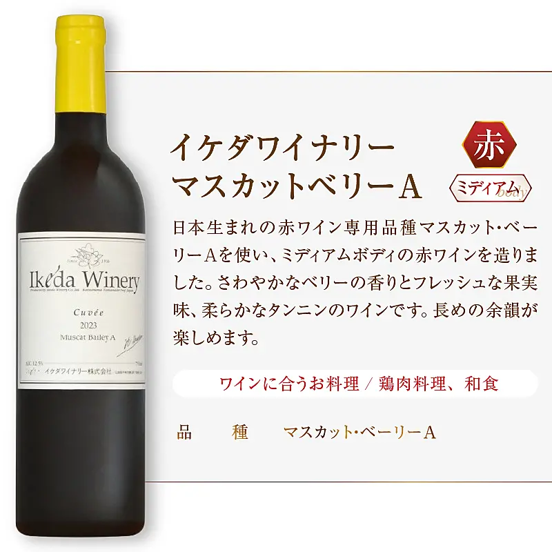 特徴:日本生まれの赤ワイン専用品種マスカット・ベーリーAを使い、ミディアムボディの赤ワインを造りました。さわやかなベリーの香りとフレッシュな果実味、柔らかなタンニンのワインです。長めの余韻が楽しめます。