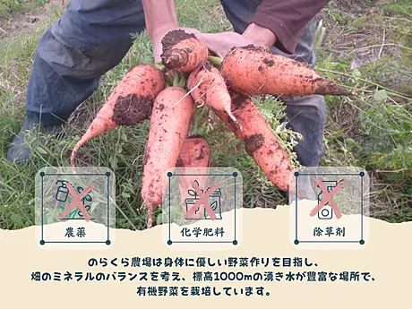 のらくら農場は身体に優しい野菜作りを目指し、畑のミネラルのバランスを考え、標高1000mの湧き水が豊富な場所で、有機野菜を栽培しています。