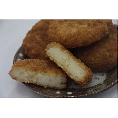 普通のコロッケに入っているような「玉ねぎ」や「肉」は入っていません。100%新じゃがいものみの だしのきいた甘めの味のコロッケです。一口食べると何ともいえない懐かしい味がします。次々と食べたくなる味です。