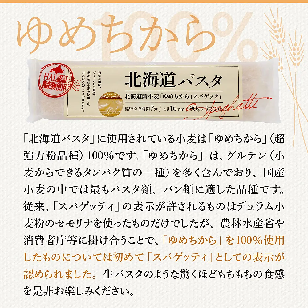 「HAL認証農産物」 に認定された「ゆめちから」を使用。HAL認証農産物とは、一般社団法人北海道農業企業化研究所(HAL財団)が定めた特別栽培基準によって作られた、「安心で安全な美味しい」北海道の農産物です。