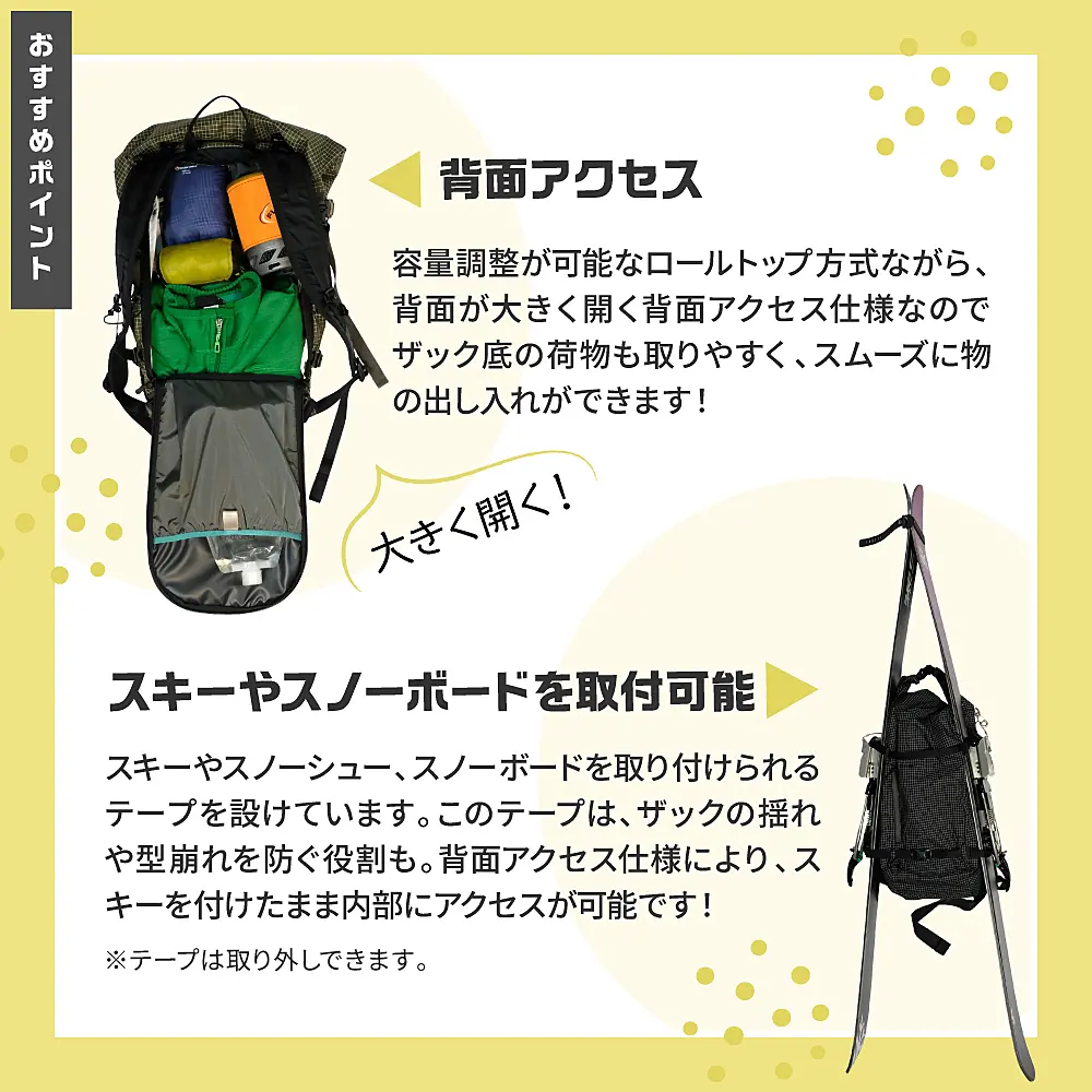 本体にスキーやスノーシュー、スノーボードを取り付けられるテープを設けています。