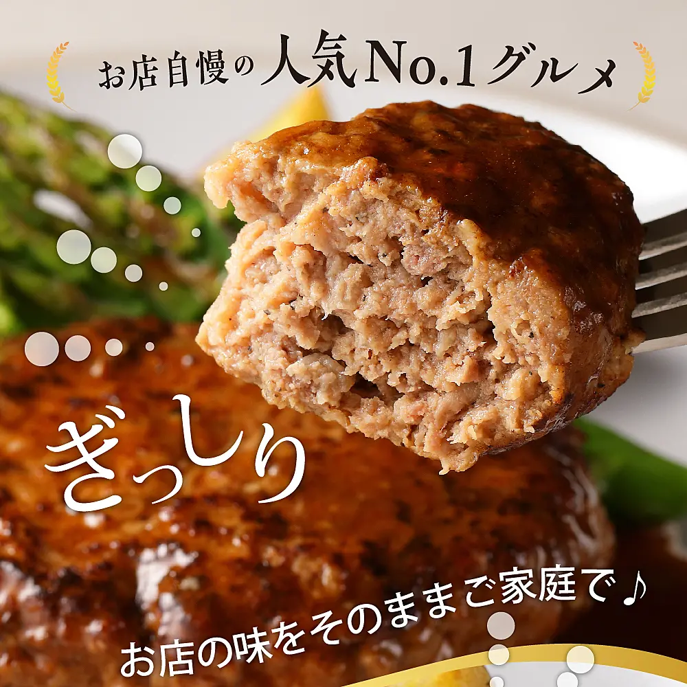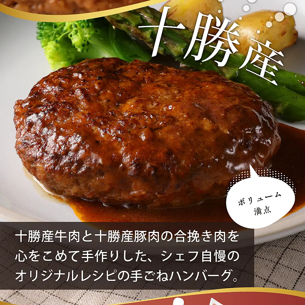 ハンバーグはお店の味をそのままお届け。十勝産牛肉と十勝産豚肉の合挽き肉を心をこめて手作りした、シェフ自慢のオリジナルレシピの手ごねハンバーグです。オープン以来、人気NO1のメニューとなっています!