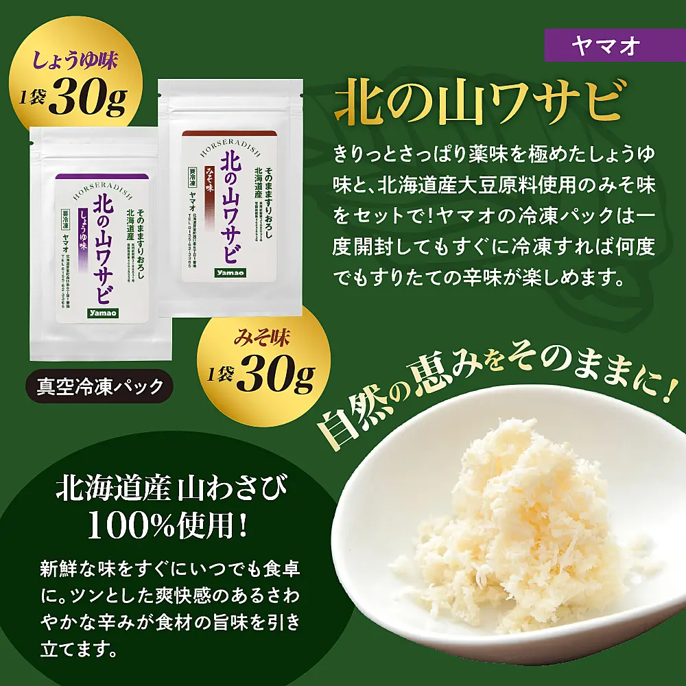 山ワサビは当地上美生地区山わさびに日高山脈の湧き水で育った本山葵をブレンドした国内初の商品です。すりおろす手間いらず、使いたい量をパックから取り出し、すぐに食卓へ。