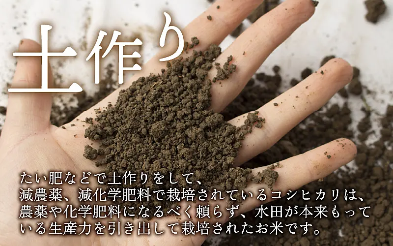 減農薬、減化学肥料で栽培されているコシヒカリは、農薬や化学肥料になるべく頼らず、水田が本来もっている生産力を引き出して栽培されたお米です。