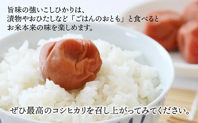 旨味の強いこしひかりは、煮物やハンバーグなど濃いめのおかずにも負けない存在感があります。和食・洋食問わずどんなおかずにも合いますが、漬物やおひたしなど「ごはんのおとも」と食べるとお米本来の味を楽しめます。