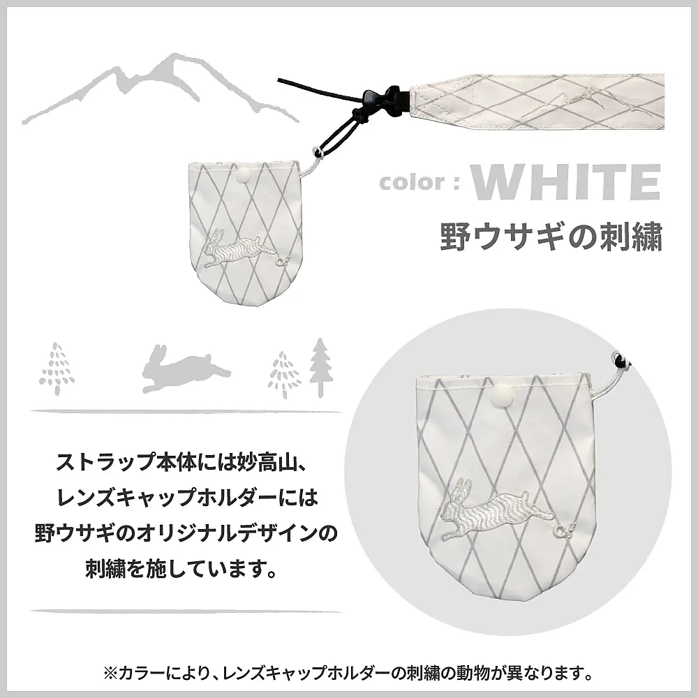 ストラップ本体には妙高山、レンズキャップホルダーには、野ウサギの刺繍です。