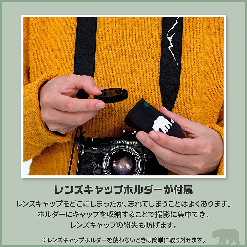 レンズキャップをどこにしまったか、忘れてしまうことはよくあります。ホルダーにキャップを収納することで、撮影に集中できます。