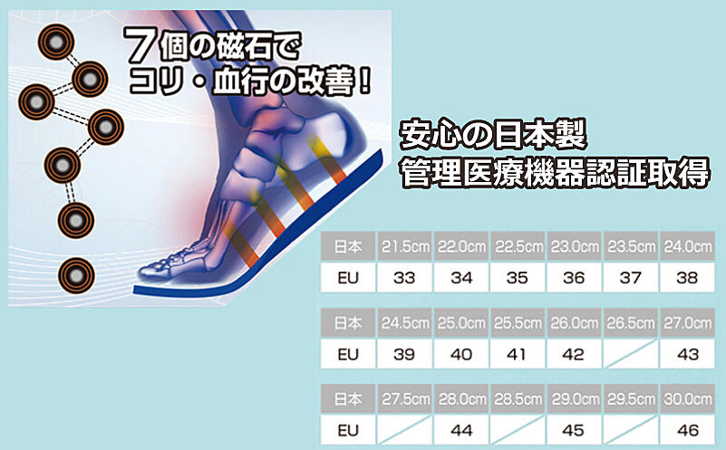 足裏のツボに沿って計14個の磁石を緻密に配置した磁気インソールです。磁力が足裏全体に働きかけ、歩行時や立ち仕事中でも心地よい刺激を与えながら血行を促進。足から全身へリラックス効果をもたらします。靴の中敷きとして使うだけで、装着部位のこり改善や血行促進をサポートし、日常の疲れケアに役立つアイテムです。ハサミでカットしてサイズ調整ができ、男女問わず幅広い靴に対応。安心の日本製・管理医療機器認証済みで、日々の健康習慣に取り入れやすいインソールです。