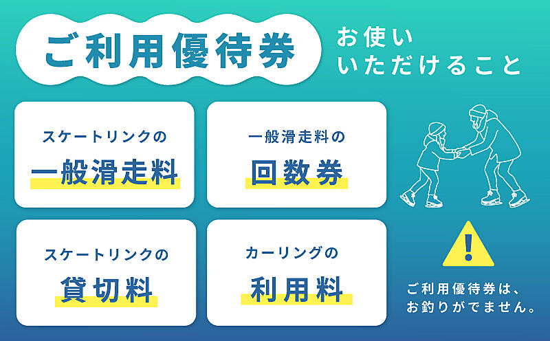 この利用券で日本国内の有名選手も利用するスケートリンクの一般滑走料、一般滑走料の回数券、リンク貸切、ロッカー(月貸し)利用券などの費用にご利用いただけます。