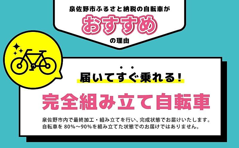 本自転車は泉佐野市内で最終加工・組立てを行い、完成状態でお届けいたします。自転車を80%~90%を組み立てた状態でのお届けではありません。ご自身で組み立てる必要はございませんので、お届け後すぐにお使いいただけます。