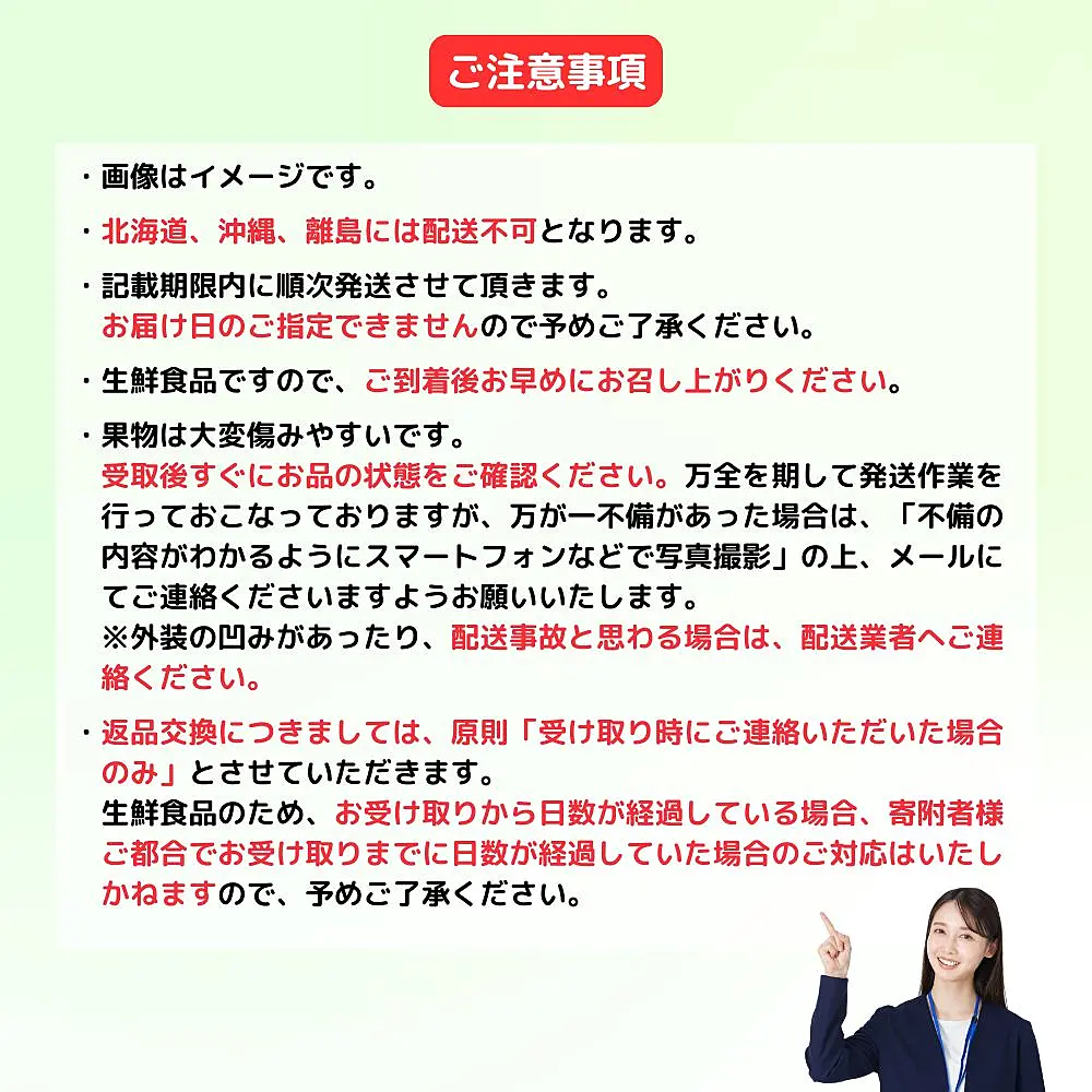 ・果物は大変傷みやすいです。受取後すぐにお品の状態をご確認ください。万全を期して発送作業をおこなっておりますが、万が一不備があった場合は、「不備の内容がわかるようにスマートフォンなどで写真撮影」の上、メールにてご連絡くださいますようお願いいたします。