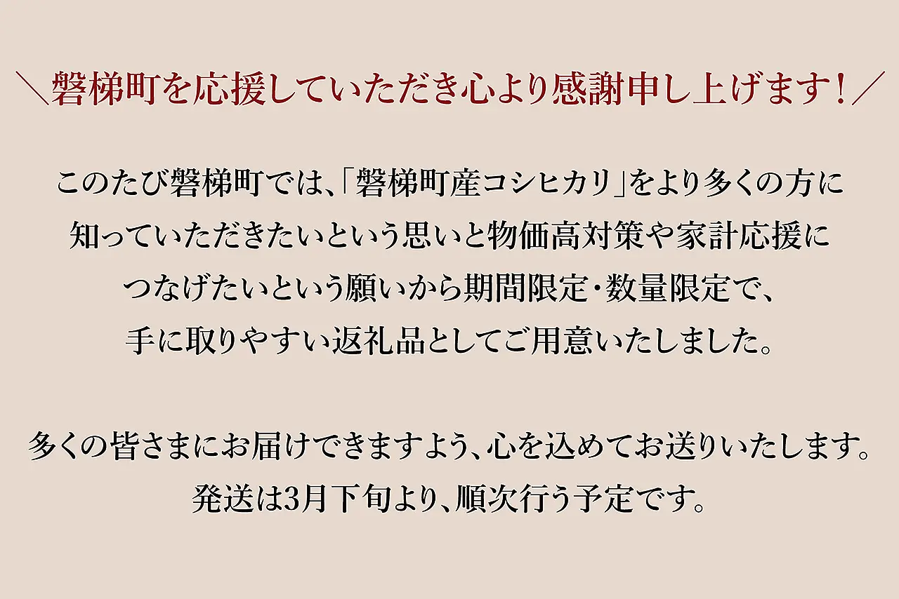このたびは、「磐梯町産コシヒカリ」を多くの方に知っていただきたい思いと、物価高対策・家計応援につながればという気持ちから、より手に取りやすい期間限定、数量限定の返礼品としてご用意いたしました。