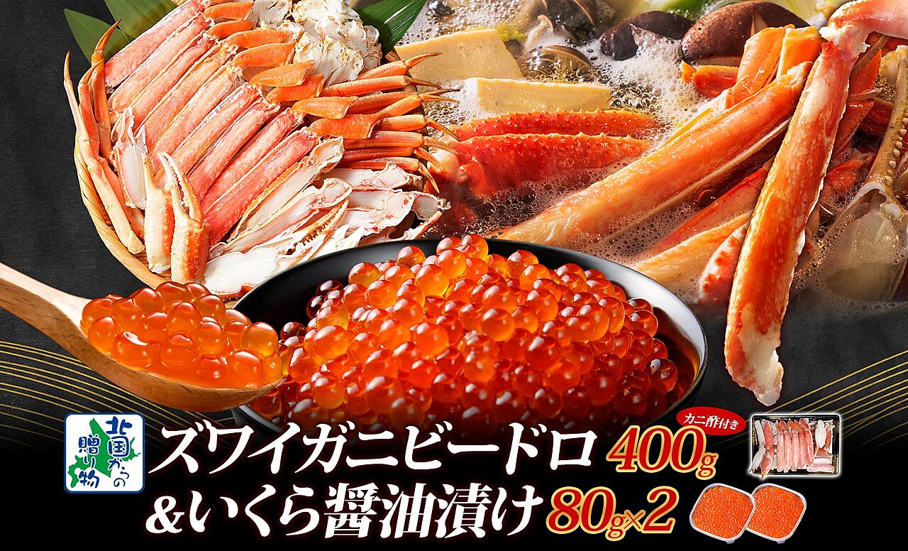 099H3448 昆布塩加工 ボイルズワイ蟹 ビードロカット 400g前後 約2人前&いくら醤油漬け 80g×2パック