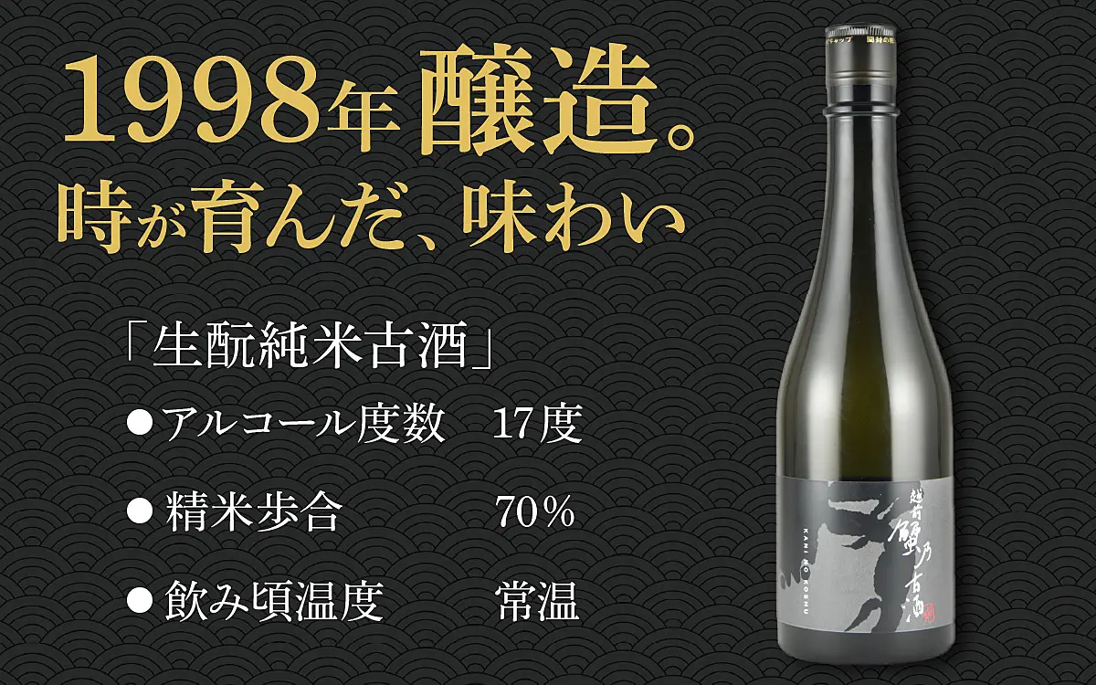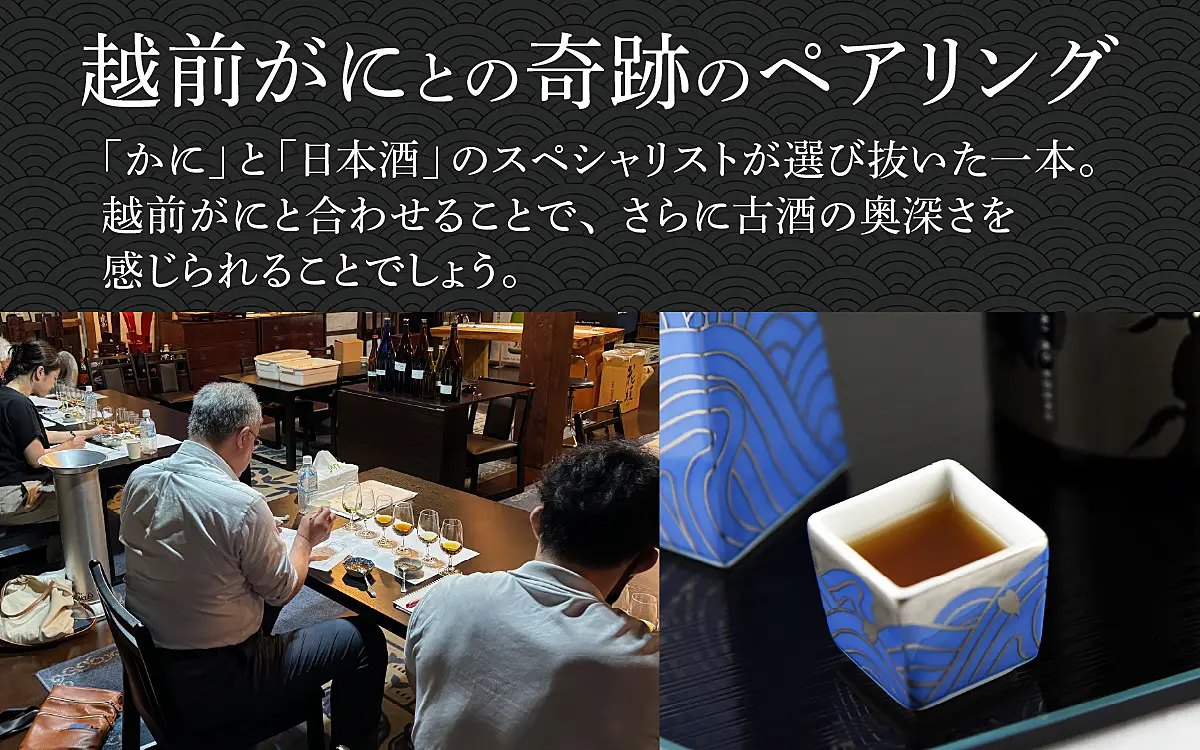 越前蟹乃古酒は自然の乳酸菌の力を利用する伝統的製法「生酛」で、1998年に醸造された純米古酒。深みのある味わいとキレは、唸るような存在感。