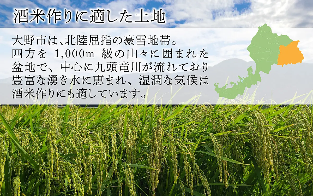 水:奥越前の水…ミネラルが程よく溶け込んだ軟水で蔵敷地内の地下50Mから汲み上げた地下水です。「ふくいのおいしい水」に認定された「七間清水」と同じ水脈となります。