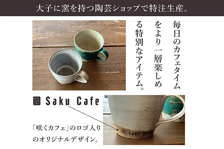店頭販売でも人気の陶器マグカップ。咲くカフェのロゴ入りのオリジナルデザインで大子に窯を持つ陶芸ショップで特注生産しています。