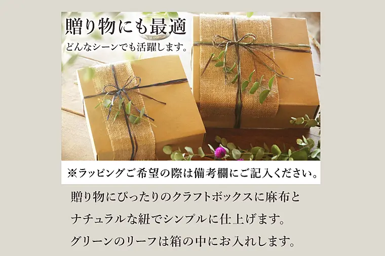 贈り物にぴったりのクラフトボックスに麻布とナチュラルな紐でシンプルに仕上げます。グリーンのリーフは箱の中にお入れします。