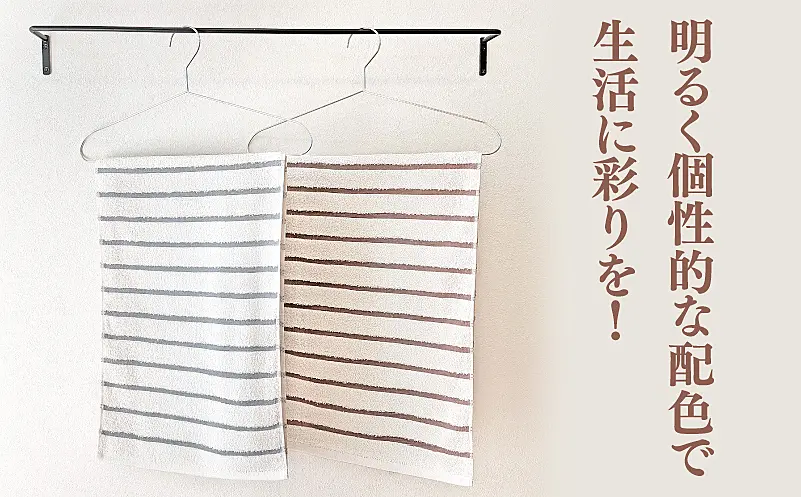 泉州タオルでは珍しい、個性的なボーダー配色と、アクセントになるヘムのカラーリング。洗面所やバスルームを明るく彩る、遊び心あふれるデザインです。