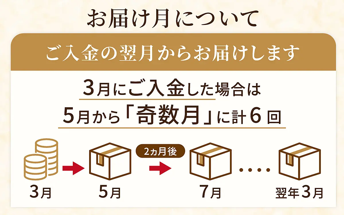 初回(1回目)のお届けは、寄付金のご入金確認後、翌月以降の対象月より6回お届け