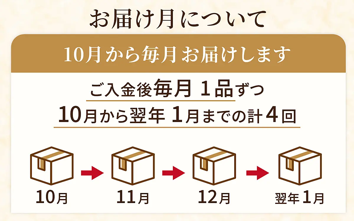 初回(1回目)のお届けは、寄付金のご入金確認後、翌月以降の対象月より4回お届け