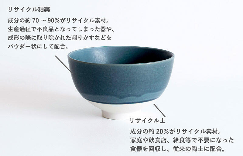 枯渇している陶土や消費期限の短い釉薬。多くの職人が困っている課題に着目して作られたお茶碗です。リサイクル土と釉薬を利用しています。ソーシャルプロダクツアワード受賞。食洗器や電子レンジの使用可能です。ギフトにも最適。