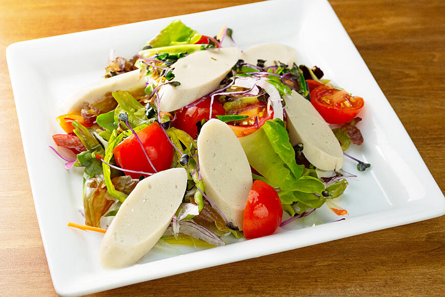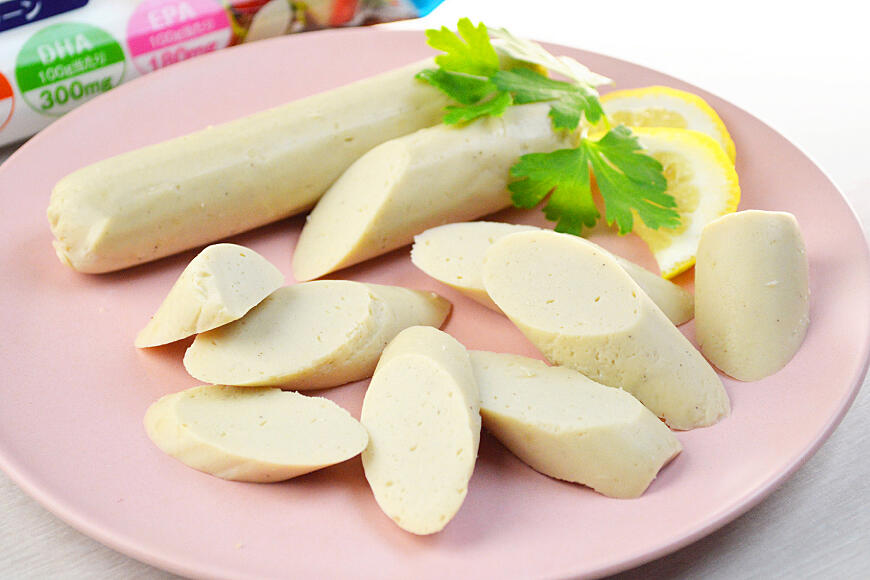 - 魚肉(ヨシキリザメ(宮城県産)、スケトウダラ(アメリカ)、ネズミザメ(宮城県産))、結着材料(でん粉、粉末状大豆たん白)、サーモンオイル、砂糖、食塩、白胡椒、オレガノ、バジル、ガーリック/ソルビトール、ゲル化剤(増粘多糖類)、調味料(アミノ酸等)、(一部に大豆・さけを含む)