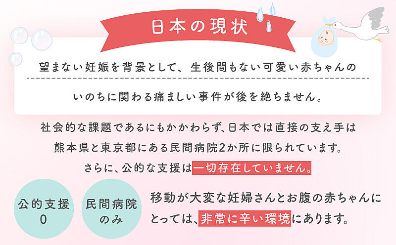 社会的な課題であるにもかかわらず、日本では直接の支え手は熊本県と東京都にある民間病院2か所に限られています。さらに、「公的支援0」「民間病院のみ」公的な支援は一切存在していません。