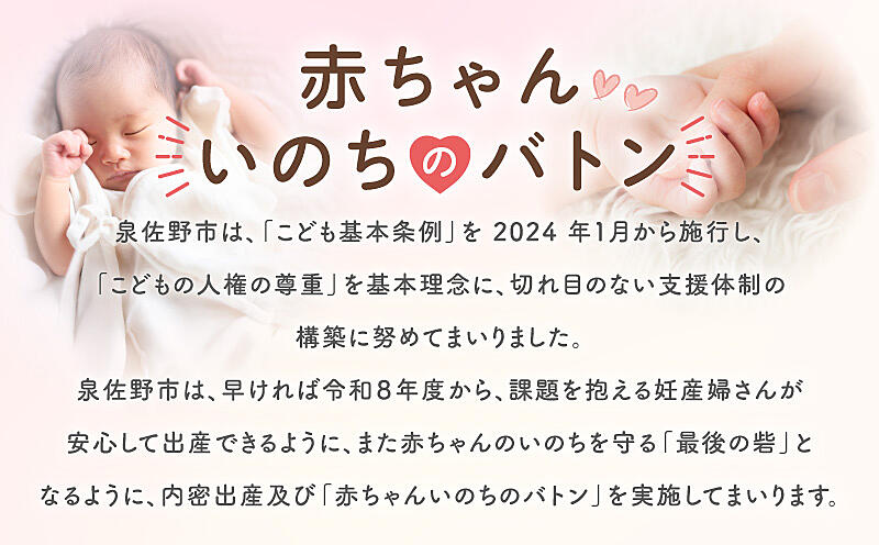 泉佐野市は、早ければ令和8年度から、課題を抱える妊産婦さんが安心して出産できるように、また赤ちゃんのいのちを守る「最後の砦」となるように、内容を調整し「赤ちゃんいのちのバトン」を実施してまいります。