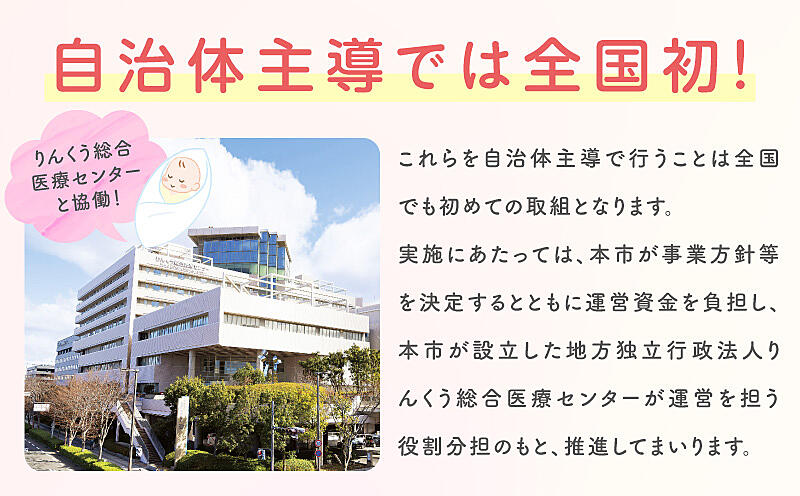 実施にあたっては、市が事業方針等を決定するとともに運営資金を負担し、本市が設立した地方独立行政法人りんくう総合医療センターが運営を担う役割分担のもと、推進してまいります。