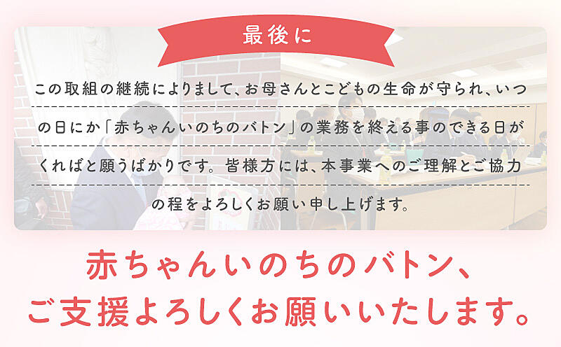 最後にこの取組の継続によりまして、お母さんとこどもの生命が守られ、いつの日にか「赤ちゃんいのちのバトン」の業務を終える事のできる日がくればと願うばかりです。
