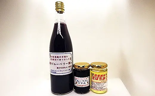 ブルーベリージュースとジャムは、自家農園で1粒1粒手摘みした完熟ブルーベリーを厳選加工しました。