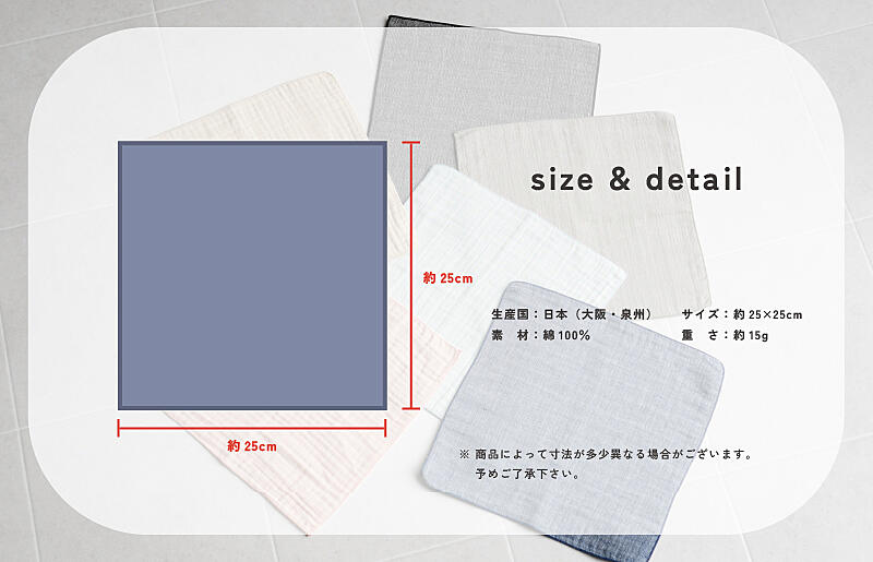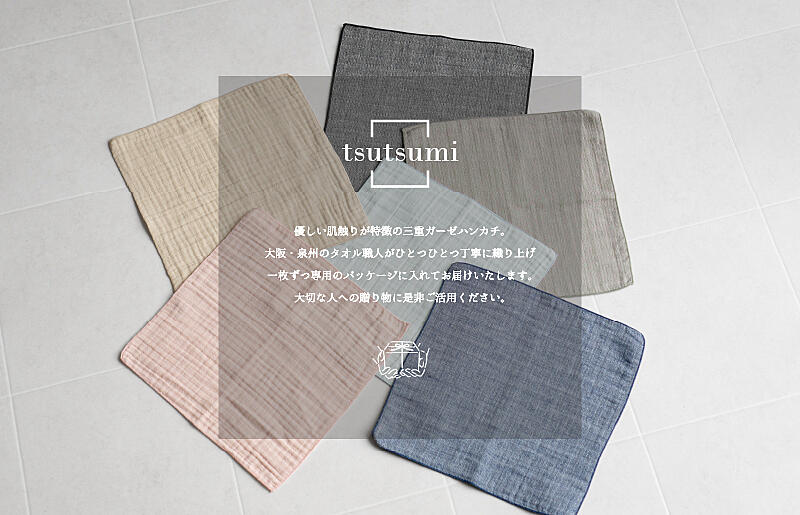 大阪泉州のタオル職人がひとつひとつ丁寧に心を込めて作製した安心のガーゼハンカチです。